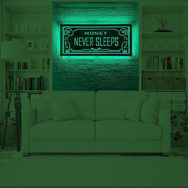 Our Golden Mirror Wall Decor with a captivating Green Neon Backlight that says “Money Never Sleeps” will turn any room into a stylish haven of inspiration. This beautiful piece combines luxury and motivation in a way that looks great and shows off both your style and your goals.This wall art has a shiny golden mirror finish that makes it look sophisticated and classic. The bright green neon lights give it a modern look and makes a lively focus point that stands out.You can hang it in your office, living room, or anywhere else you want to boost your desire to make money. Use the bright glow to remember yourself that success is 24/7 endeavor. This powerful phrase will raise your energy and make your walls a statement of your goals.